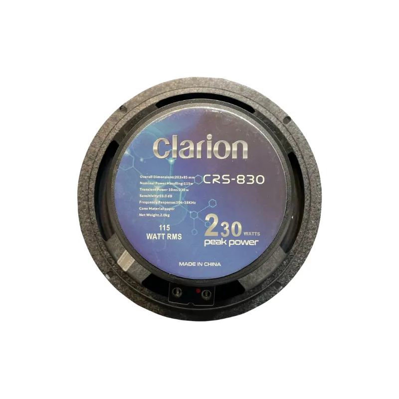میدرنج 8 اینچ کلاریون مدل Clarion CRS-830 یک میدرنج 8 اینچی است که برای سیستمهای صوتی خودرو طراحی شده است. این مدل دارای توان اسمی 115 وات و توان پیک 230 وات است. حساسیت آن 93 دسیبل است که باعث تولید صدای واضح و بلند میشود. فرکانس پاسخگویی آن از 104 هرتز تا 18 کیلوهرتز است که قادر به تولید صداهای میانه و بالا با کیفیت است. جنس مخروط اسپیکر از کاغذ است که کمک میکند صدای طبیعی و شفافتری تولید شود. امپدانس اسمی این اسپیکر 4 اهم است و قطر سیمپیچ آن 35.5 میلیمتر است. ارتفاع سیمپیچ نیز 9.3 میلیمتر است که به کنترل دقیق حرکت مخروط کمک میکند. وزن خالص اسپیکر 2 کیلوگرم است و ابعاد کلی آن 203 × 85 میلیمتر میباشد. این میدرنج در بستههای 2 عددی عرضه میشود و از برند معتبر کلاریون است.