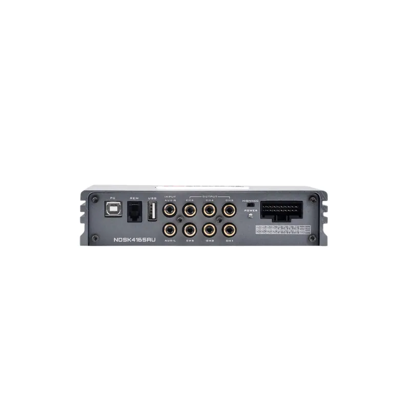 آمپلیفایر پروسسور NDSK4165AU یک پردازنده صوتی دیجیتال برای خودرو است که توان RMS آن برای بلندگوهای ۴ اهم برابر ۴ × ۲۵ وات و برای بلندگوهای ۲ اهم برابر ۴ × ۵۰ وات است. این پروسسور دارای ورودی خطی RCA دو کاناله برای اتصال منابع صوتی استاندارد و همچنین ورودی سطح بالا چهار کاناله با سوئیچینگ خودکار است که اتصال مستقیم از خروجی بلندگوهای خودرو را بدون نیاز به مبدل امکان پذیر می کند. خروجیها شامل خروجی خطی RCA شش کاناله برای اتصال به آمپلیفایرهای جداگانه و خروجی سطح بالا چهار کاناله برای سیستمهای صوتی با ورودی سطح بلندگو هستند.